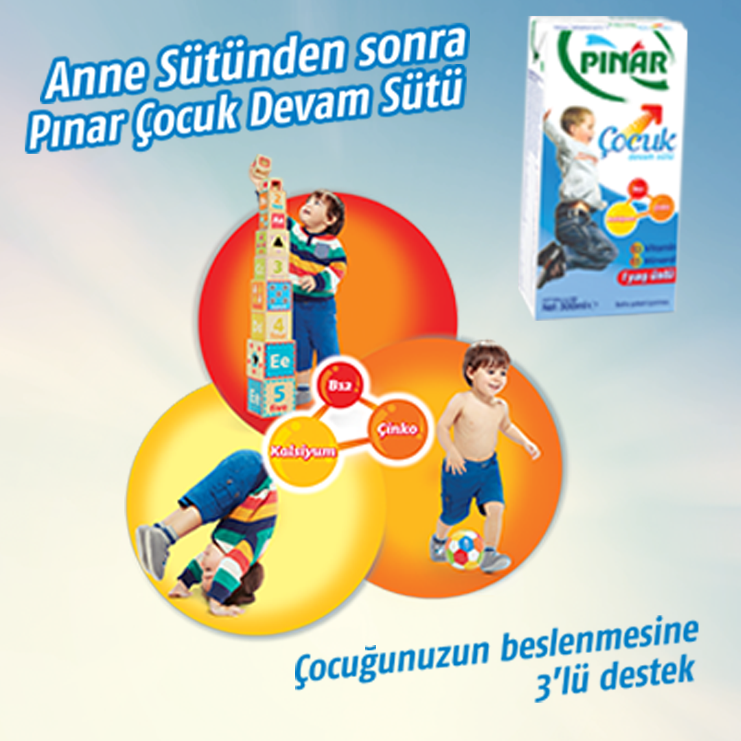 1 yaşından büyük çocuklarınızın fiziksel ve zihinsel sağlıklı gelişimini ve bağışıklık sisteminin güçlenmesini desteklemek için, saf süte prebiyotik lifler, vitamin ve mineraller ilave edilerek geliştirilen Pınar Çocuk Devam Sütü’nü güvenle içirebilirsiniz. Pınar Çocuk Devam Sütleri B12, Çinko ve Kalsiyum kaynağıdır.